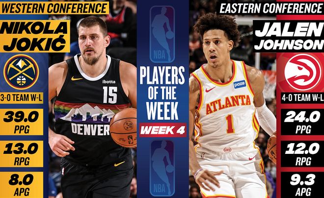 NBA官方公布了第4周的东西部周最佳球员,东部由老鹰前锋杰伦约翰逊当选,西部由掘金中锋约基奇当选。杰伦约翰逊上周场均贡献24分+12篮板+9.3助攻+2.5抢断,命中率为60.3%,三分球命中率为57.1%,带领老鹰豪取西部客场4连胜。据统计,这是老鹰近54年来首次取得西部客场4连胜。同时,这也是杰伦约翰逊生涯首次获此殊荣。约基奇上周场均爆砍39分+13篮板+8助攻,投篮命中率为73.7%、三分命中率高达64.3%,率领掘金打出3胜0负的战绩。据统计,这是约基奇本赛季第2次拿到周最佳,也是生涯第19次获此殊荣,刷新自己保持的队史纪录。值得一提的是,字母哥、巴恩斯、杰伦布朗、詹金斯、唐斯、小瓦格纳、库里、东契奇、华子、SGA、哈登、马卡和申京等人获得了周最佳提名。