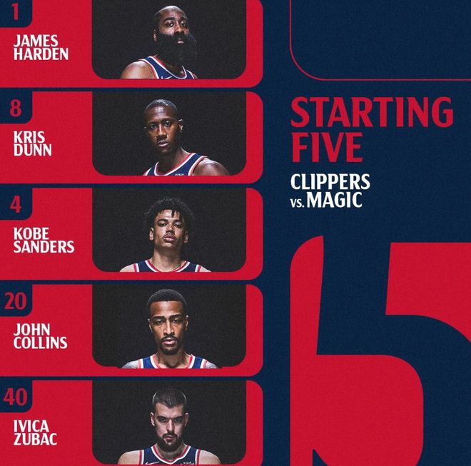 赛前,美媒ESPN预测了本场比赛的最新胜率:快船胜率仅有31%,而魔术队则高达69%,差距明显。今日比赛,首发阵容方面,快船队这边,科怀-伦纳德、小德里克-琼斯、布拉德利-比尔、乔丹-米勒继续缺战,主帅泰伦-卢排出的最新首发五人组为:詹姆斯-哈登、克里斯-邓恩、科比-桑德斯、约翰-科林斯、伊维察-祖巴茨;魔术队这边,班凯罗缺席,首发阵容则为:小瓦格纳、小卡特、贝恩、萨格斯、达-席尔瓦。