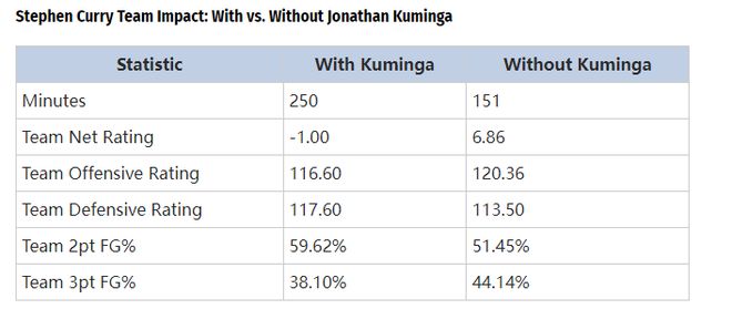 勇士队的首要任务是最大限度地增加库里周围的支持,以提高球队的天花板。而库明加确实给勇士队的首发阵容,尤其是斯蒂芬-库里带来了非常负面的影响。数据证明当库里在场,而库明加在场下休息时,勇士队是一支更好的球队。当库里与库明加同时在场时,勇士队的净得分为-1,而当库里在场,而库明加在场下休息时的净得分则为+6.88。此外,当库里没有库明加在场上时,勇士队的三分球命中率明显更高。