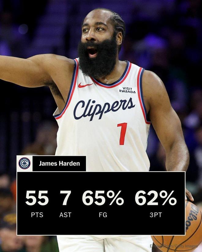 快船队超级巨星詹姆斯哈登,在此役强势暴走。哈登出战35分钟,26中17,三分16中10,罚球14中11,狂轰55分3板7助攻1抢断。哈登以65%的命中率轰下了全场的最高分,他还以63%的命中率投进了此战最多的10记三分球。在进攻端火力全开的哈登,早早进入了得分模式,他首节轰下了27分,上半场贡献了35分。下半场,哈登再得20分,主导了比赛的走势,率队取得了24分领先,就此锁定大局。