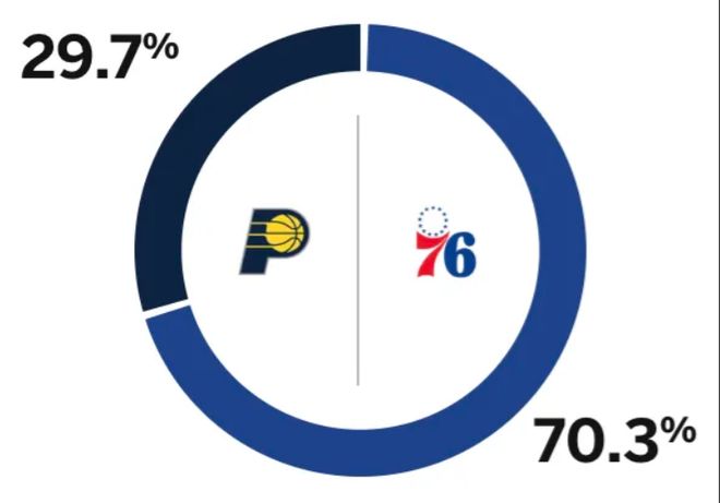 赛前,美媒ESPN对本场比赛进行了胜率预测:步行者胜率仅有29.7%,76人胜率则高达70.3%,对比非常明显。