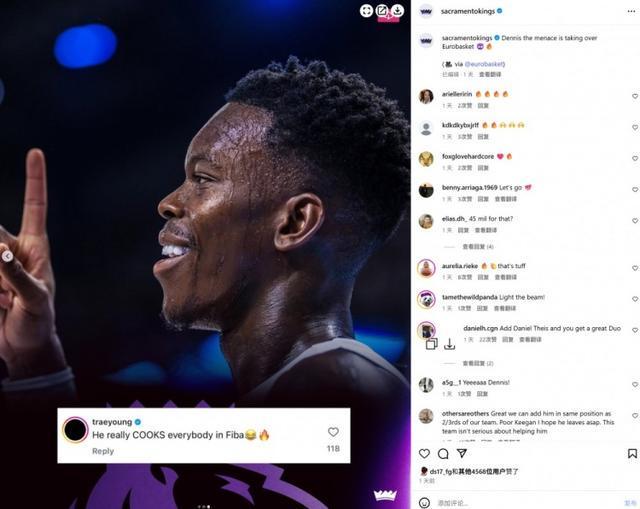国王队也晒出了老鹰球员特雷-杨对于施罗德的一个评论:“施罗德在FIBA比赛里真的把所有人都打爆了!”