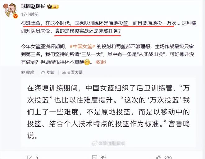 媒体人和球迷不但批评宫鲁鸣的用人,也吐槽他的训练方法。最近知名媒体人赵探长就公开吐槽宫鲁鸣的集训方式,他一针见血地提出:“很难想象,在这个时代,国家队训练还是原地投篮,而且要原地投一万次… 这种集训对队员来说,真的是模拟实战还是完成任务?”与尤文力特的热身赛之后,宫鲁鸣亲口说,“在训练提出来的万次投篮,我们做了一些调整上了一些难度,不再是原地的,我们把它和技术训练结合起来。”这等于宫鲁鸣承认了中国女篮在亚洲杯前进行的封闭训练搞的万次投篮就是定点投篮。赵探长调侃道:我们坚持的所谓“三从一大”,其中有一条是“从实战出发”,可好像并没有做到?但愿醒悟来得还不算晚。