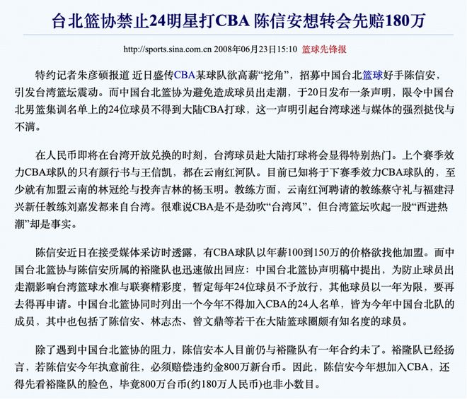 2008年,东莞新世纪有意引进陈信安(主要背景是当时人民币即将在台湾开放兑换,方便了两岸沟通),中国台北篮协迅速做出反应,禁止入选台北队集训名单的24名球员去外地打球。