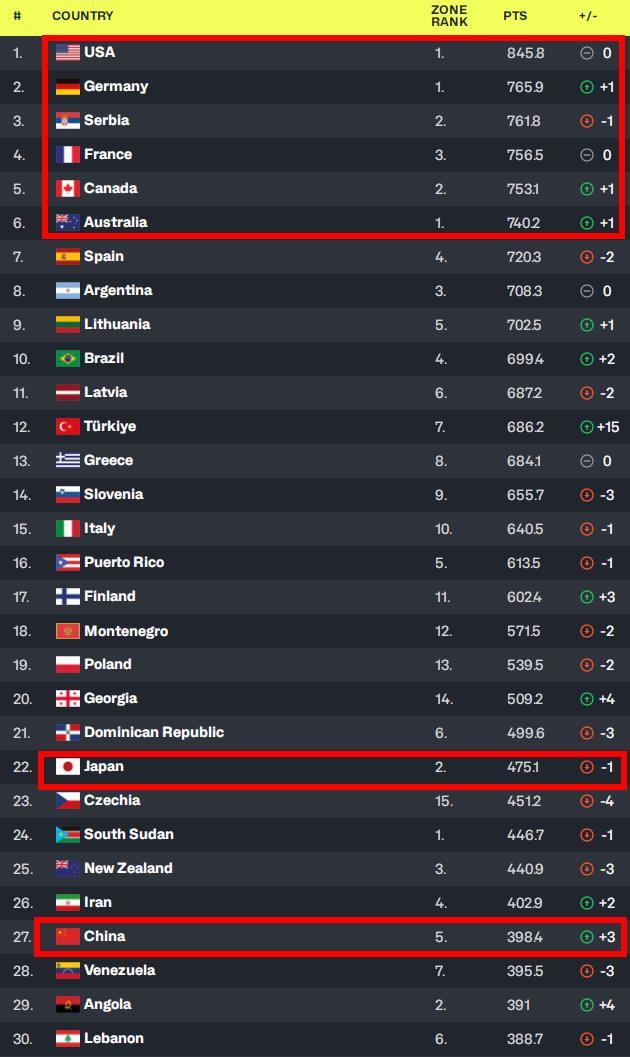 从排名中不难看出,前十顶级强队变化不大,只是位置稍微发生了些许变化,美国、德国、塞尔维亚、法国、加拿大五大顶级强队稳居世界前五,虽然塞尔维亚、法国在本届欧锦赛赛场上表现一般,但这也有许多客观因素,博格丹的中途受伤让塞尔维亚实力锐减,法国这边文班亚马、戈贝尔、富尼耶等多名顶级球员没打本就不是最强阵容。澳大利亚本届亚锦赛差点被中国男篮击败,不过他们第六的位置依旧稳固。最值得一提的就是土耳其,凭借本届欧锦赛的出色表现,他们的世界排名一下子冲到了第12,距离西部第十的巴西仅仅只有13.2积分的差距,年轻的申京展现出了极强战斗力,面对约基奇都不落下风,未来他们将是欧洲赛区的强力竞争者!
