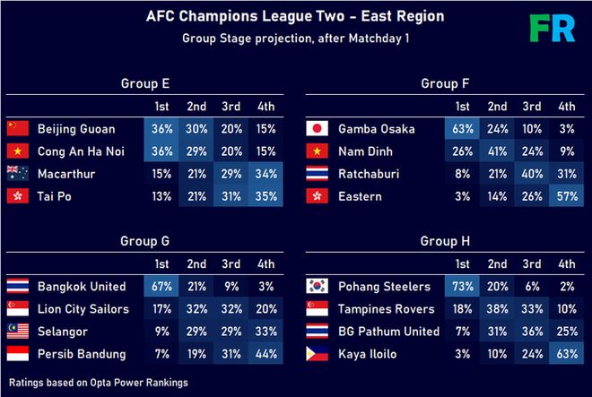 其他的球队中,韩国的浦项铁人出线的概率最高,达到93%;泰国的曼谷联排名第二,概率为88%;日本球队大阪钢巴以87%的晋级概率排在第三位;第四位是越南球队南定绿钢,晋级概率为67%。