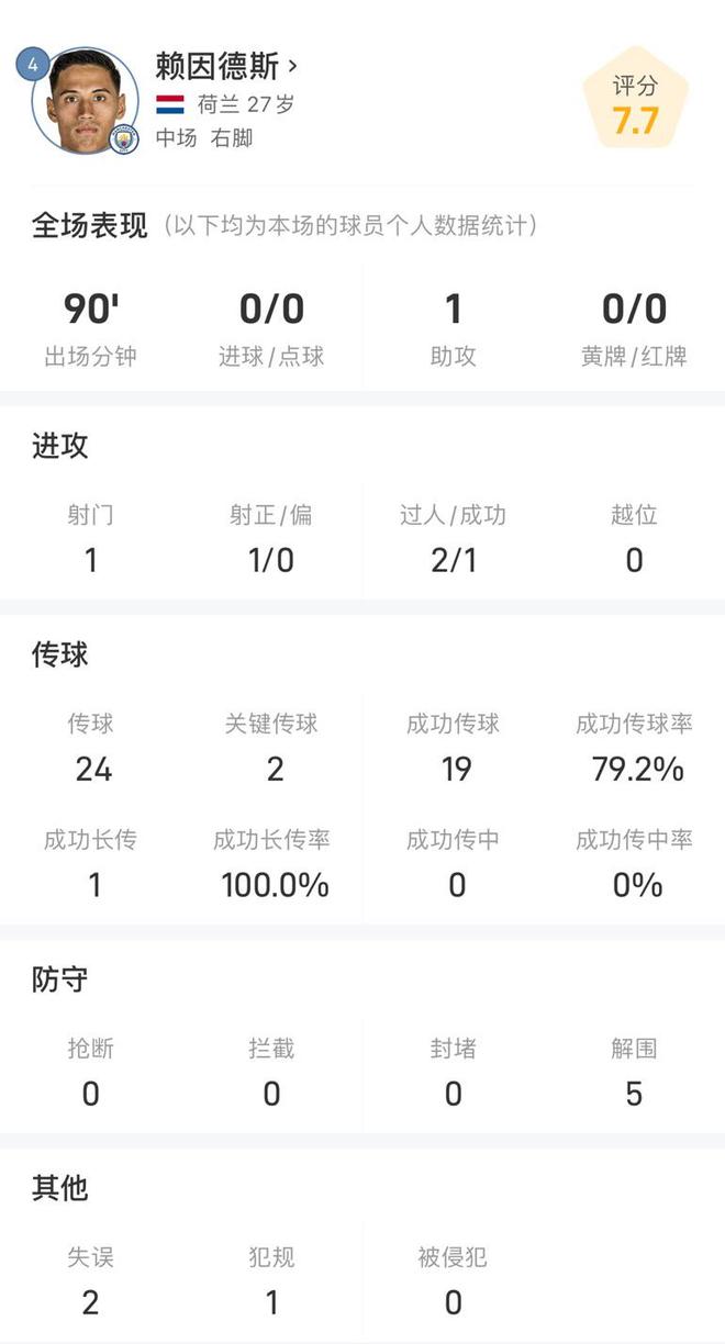 雷速体育9月22日讯 英超第5轮,曼城客场1比1战平阿森纳,曼城中场赖因德斯踢满全场,助攻哈兰德打破僵局。