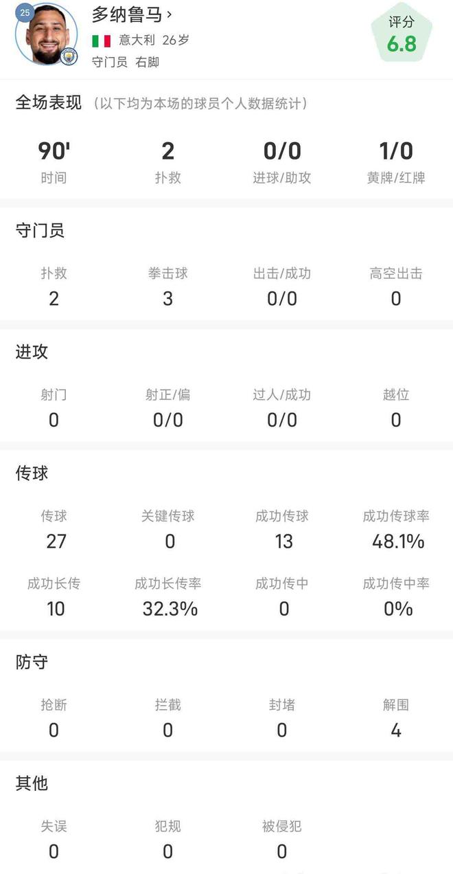 比赛中多纳鲁马还有4次解围。