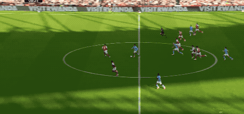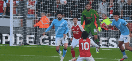 5分钟后,被压制的曼城打出快速反击,接到多库的直塞,哈兰德的射门被拉亚扑出,埃泽解围踢在赖斯身上,差点变成乌龙球。