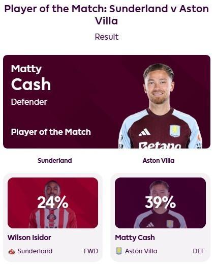本场比赛,卡什为维拉打进一球,传球成功率90.3%,贡献2次解围、1次拦截和2次抢断,7次对抗成功5次,赛后他获得39%的票数,被评为全场最佳。