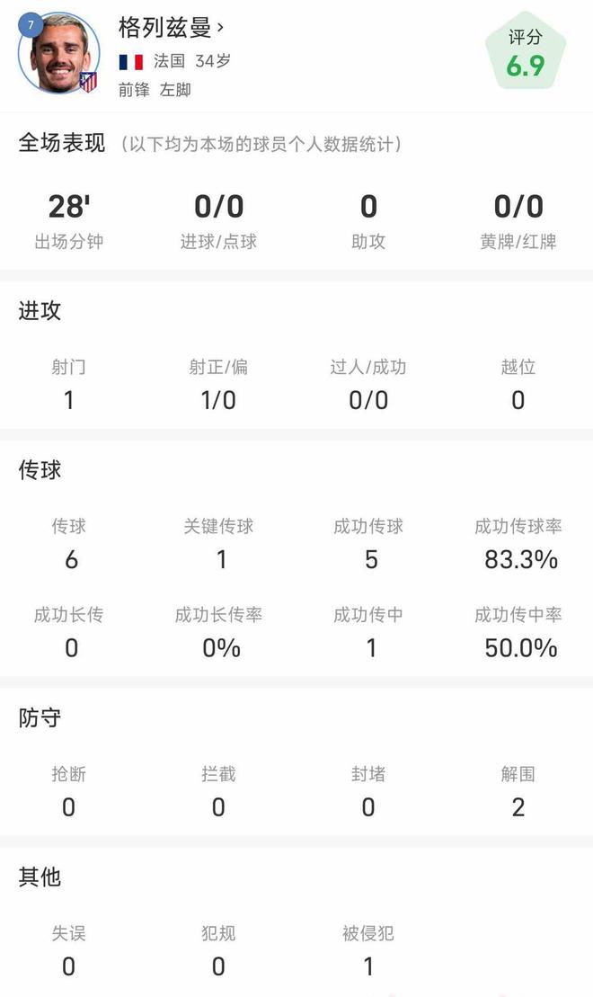 数据显示,格列兹曼本场比赛1次射门,但未能进球。