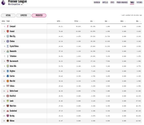 以下为英超各队夺冠概率具体预测情况(仅统计概率超1%球队):