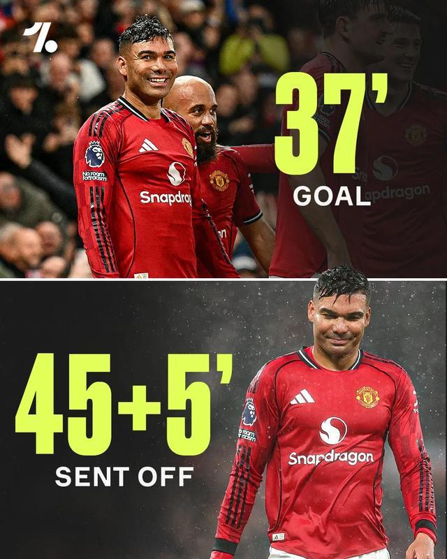 随后比赛进入卡塞米罗solo时刻,他先是在第37分钟接马奎尔助攻令红魔2比0领先;但上半场伤停补时阶段,巴西后腰毫无必要地拉倒安德雷·桑托斯,领到第2张黄牌下场,两队人数恢复平衡。