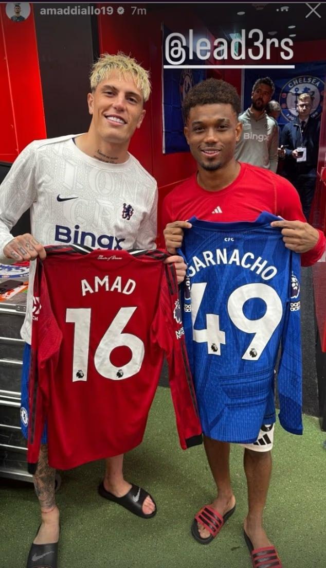 比赛结束后,加纳乔与阿玛德在球场上长时间交流,也和B费进行了简短的问候。之后阿玛德又将自己和加纳乔互换球衣的合照发到了社媒上,@的账号是两人一同所属的经纪公司。