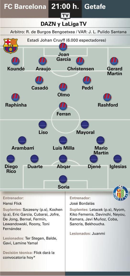 雷速体育9月21日讯 西甲第5轮巴塞罗那主场迎战赫塔菲的比赛即将在9月22日凌晨3:00打响,赛前《世界体育报》发文预测了巴萨本轮将采取的首发。在这份首发预测名单中,费兰将取代在周中欧冠首发的莱万担任中锋,队长拉菲尼亚和状态正佳的拉什福德则分别出任两个边锋。此外,奥尔莫、卡萨多预计还将分别替代费尔明及德容。